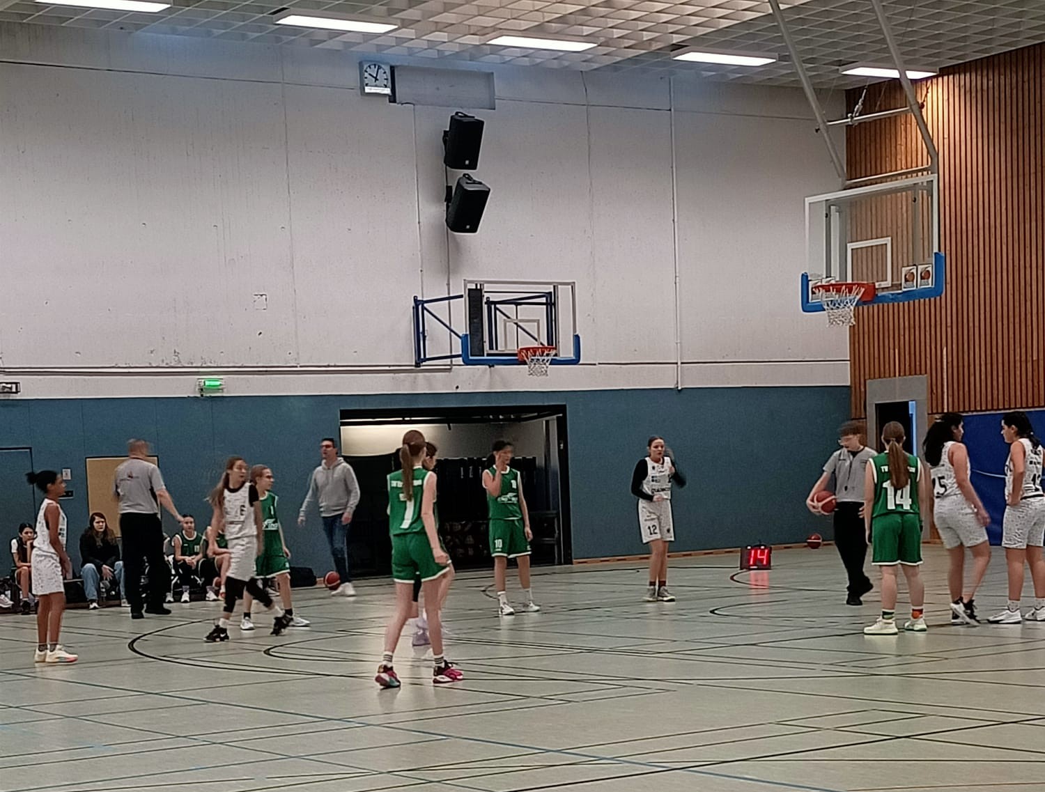 (sr) Mit einem ungefährdeten 52:23-Erfolg gewann die W14.2 am Sonntag ihr Spiel gegen Emsdetten. Die Mannschaft von Trainer Ole Müller zeigte von Beginn an eine starke Leistung und überzeugte insbesondere mit schnellen Angriffen, die immer wieder erfolgreich unter dem Korb abgeschlossen wurden.